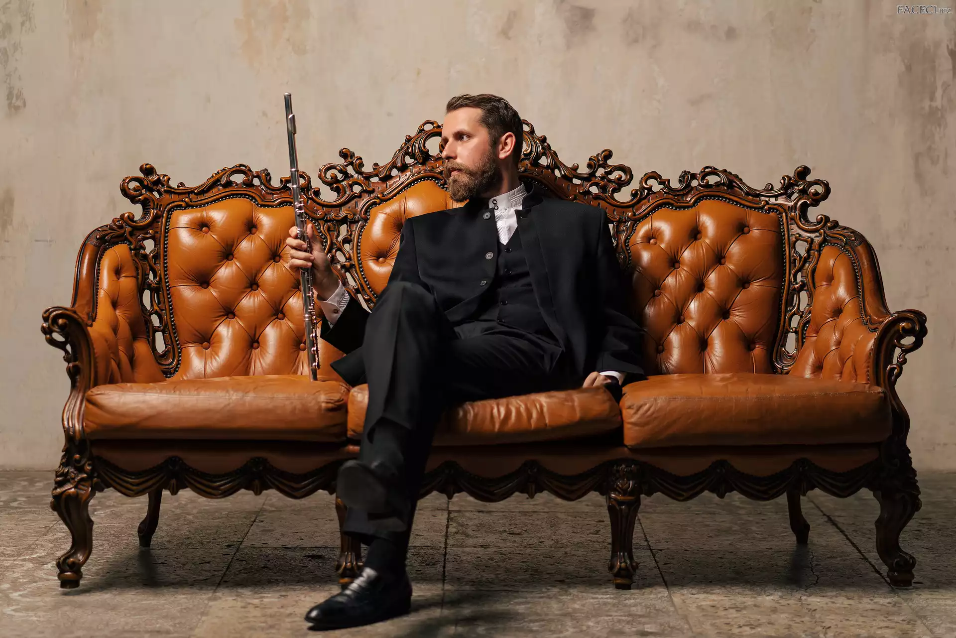 Kanapa, Wąsy, Mężczyzna, Flet, Sofa, Broda, Garnitur